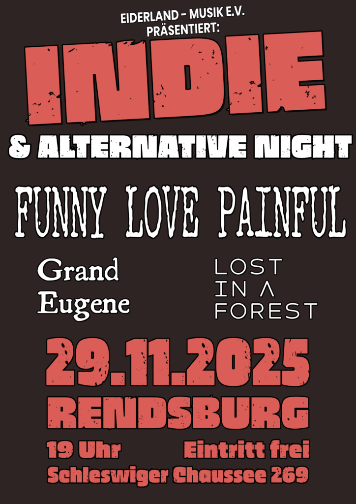 Am 29.11.2025 lassen wir es zusammen mit Grand Eugene und Lost In A Forest im Rahmen der vom Eiderland Musik e.V. präsentierten Indie- & Alternativerock Night krachen! 🤘